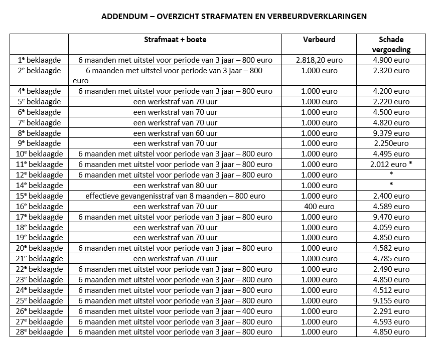 Een volledig overzicht van alle straffen, verbeurdverklaringen en schadevergoedingen per beklaagde vindt u in het addendum onderaan dit persbericht.